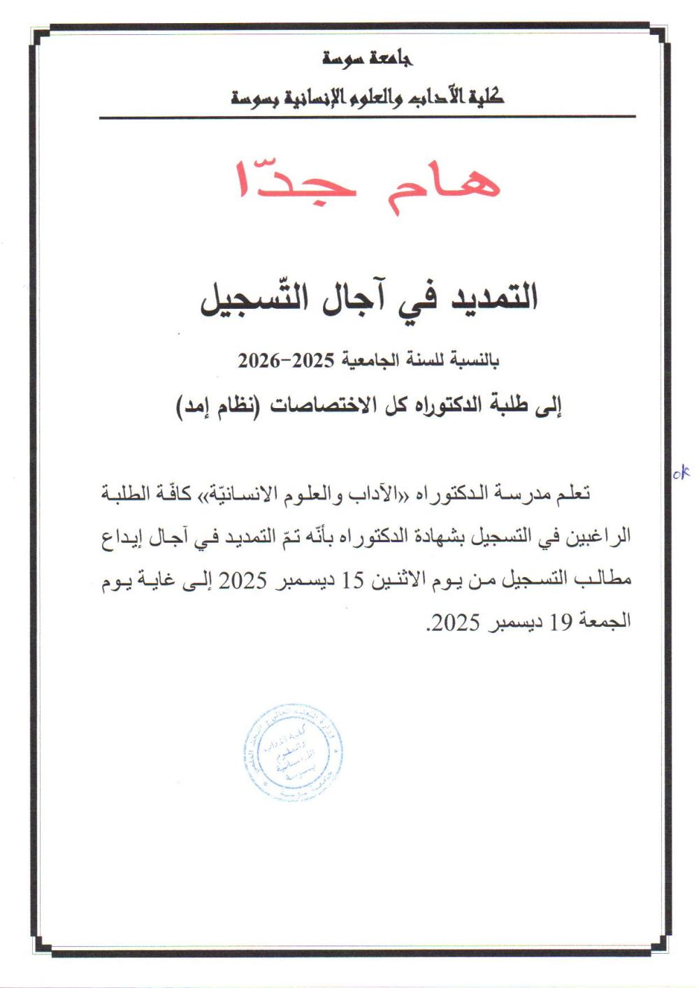 أعلنت مدرسة الدكتوراه "الآداب والعلوم الإنسانية" عن تمديد آجال التسجيل بشهادة الدكتوراه في كل الاختصاصات بعنوان السنة الجامعية 2025-2026.