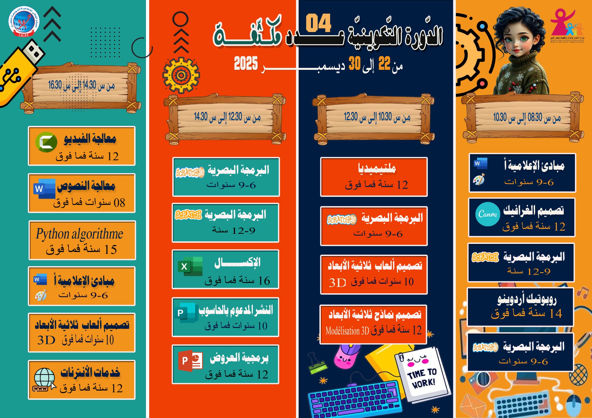 بمناسبة عطلة الشتاء، يعلن المركز الوطني للإعلامية الموجهة للطفل عن تنظيم الدورة التكوينية الرابعة لفائدة الأطفال.