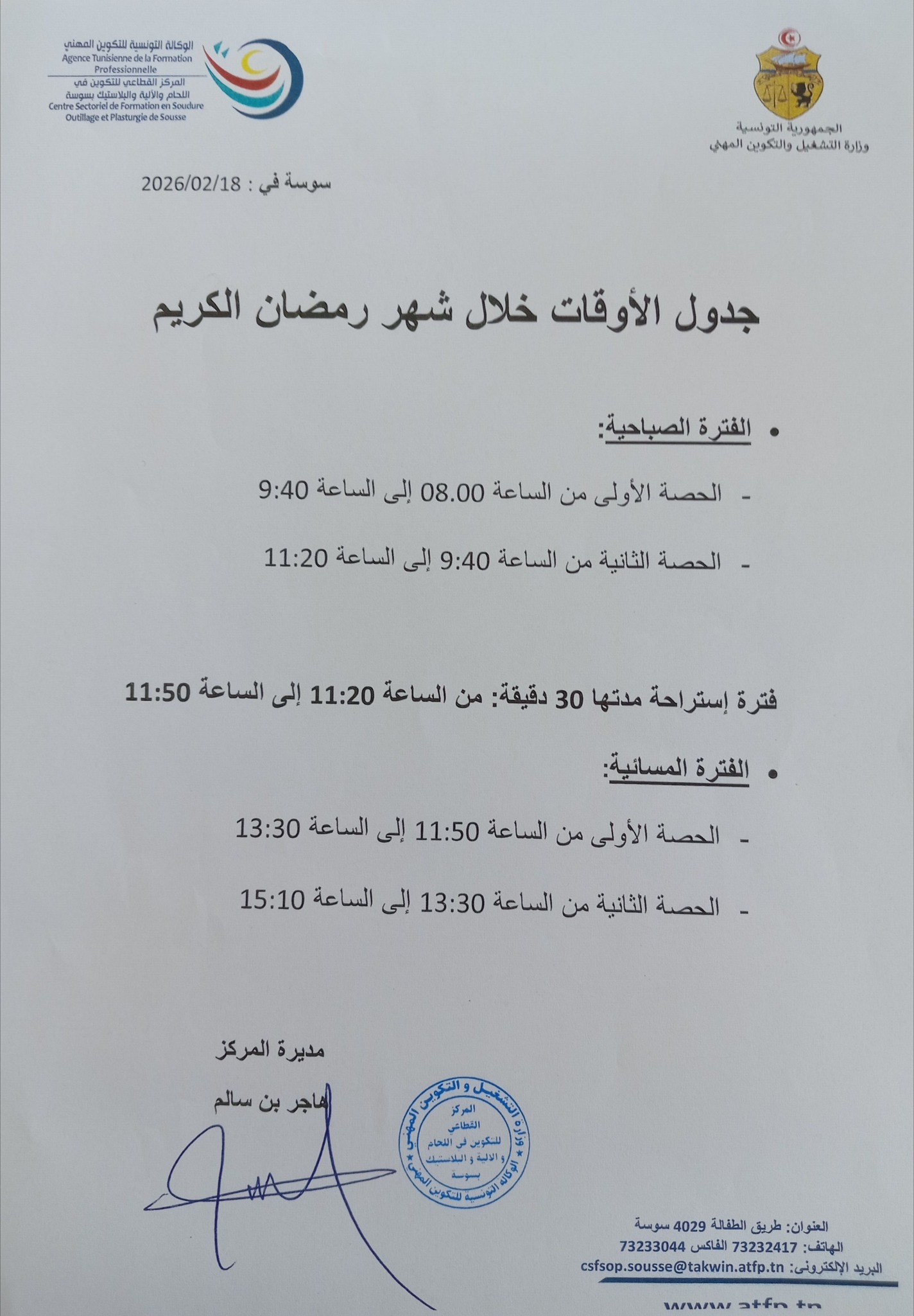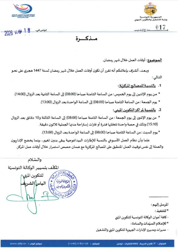 توقيت حصص التكوين خلال شهر رمضان 2026 بالنسبة لمراكز التكوين المهني :