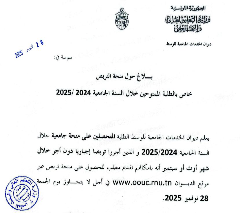 أعلن ديوان الخدمات الجامعية للوسط أنه بإمكان الطلبة المتحصلين على منحة جامعية خلال السنة الجامعية 2024-2025 والذين أجروا تربصا إجباريا خلال شهري أوت أو سبتمبر تقديم مطلب للحصول على منحة تربص على موقع الديوان عبر الرابط المرفق.