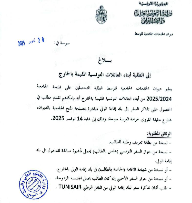 أعلن ديوان الخدمات الجامعية للوسط الطلبة المتحصلين على المنحة الجامعية 2024-2025 من أبناء العائلات التونسية المقيمة بالخارج أنه بإمكانهم تقديم مطلب في الحصول على تذاكر السفر إلى بلد إقامة الولي مباشرة بمصلحة المنح الجامعية بالديوان، شارع خليفة القروي خزامة الغربية، خزامة الغربية - سوسة، وذلك إلى غاية 14 نوفمبر 2025.