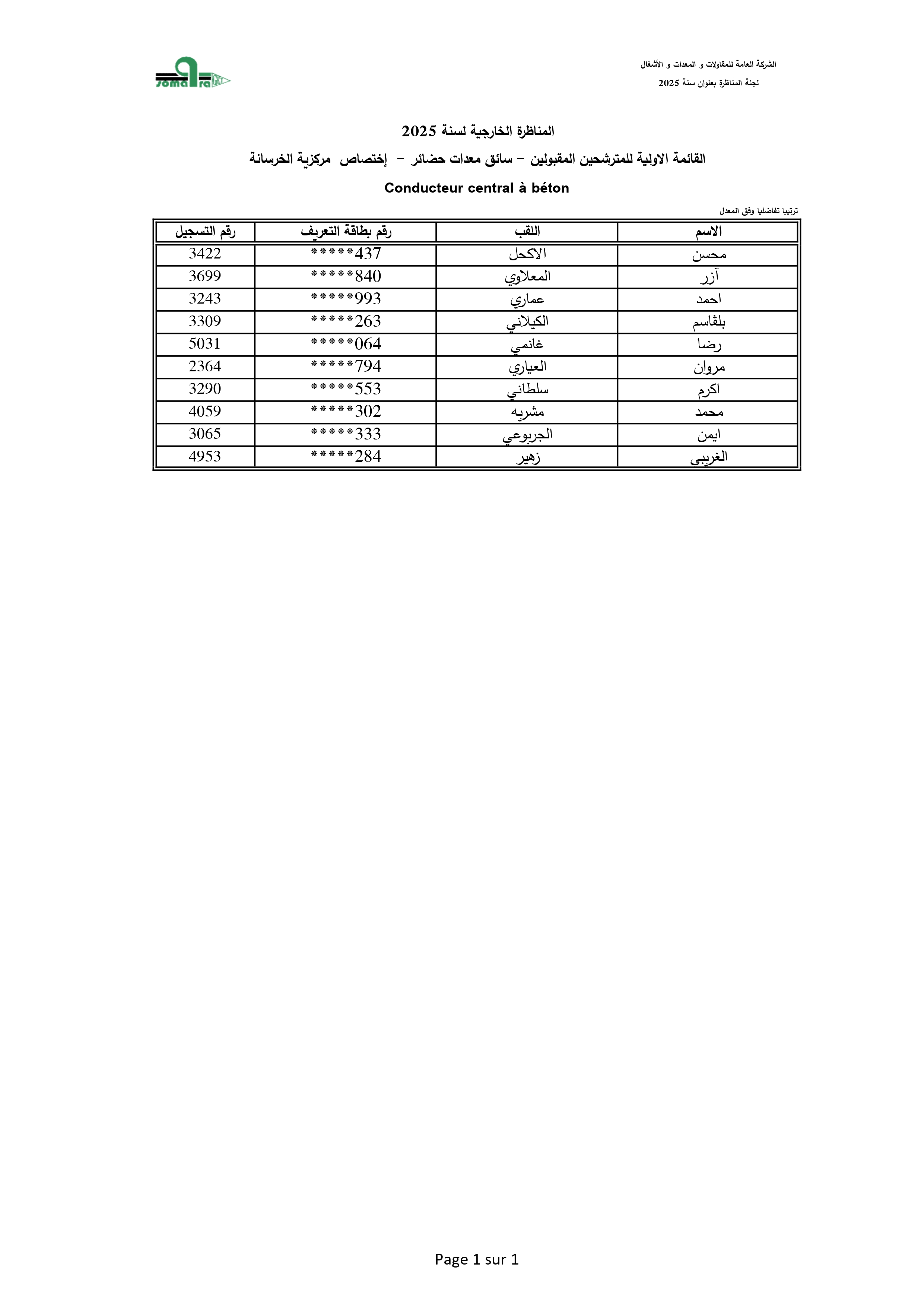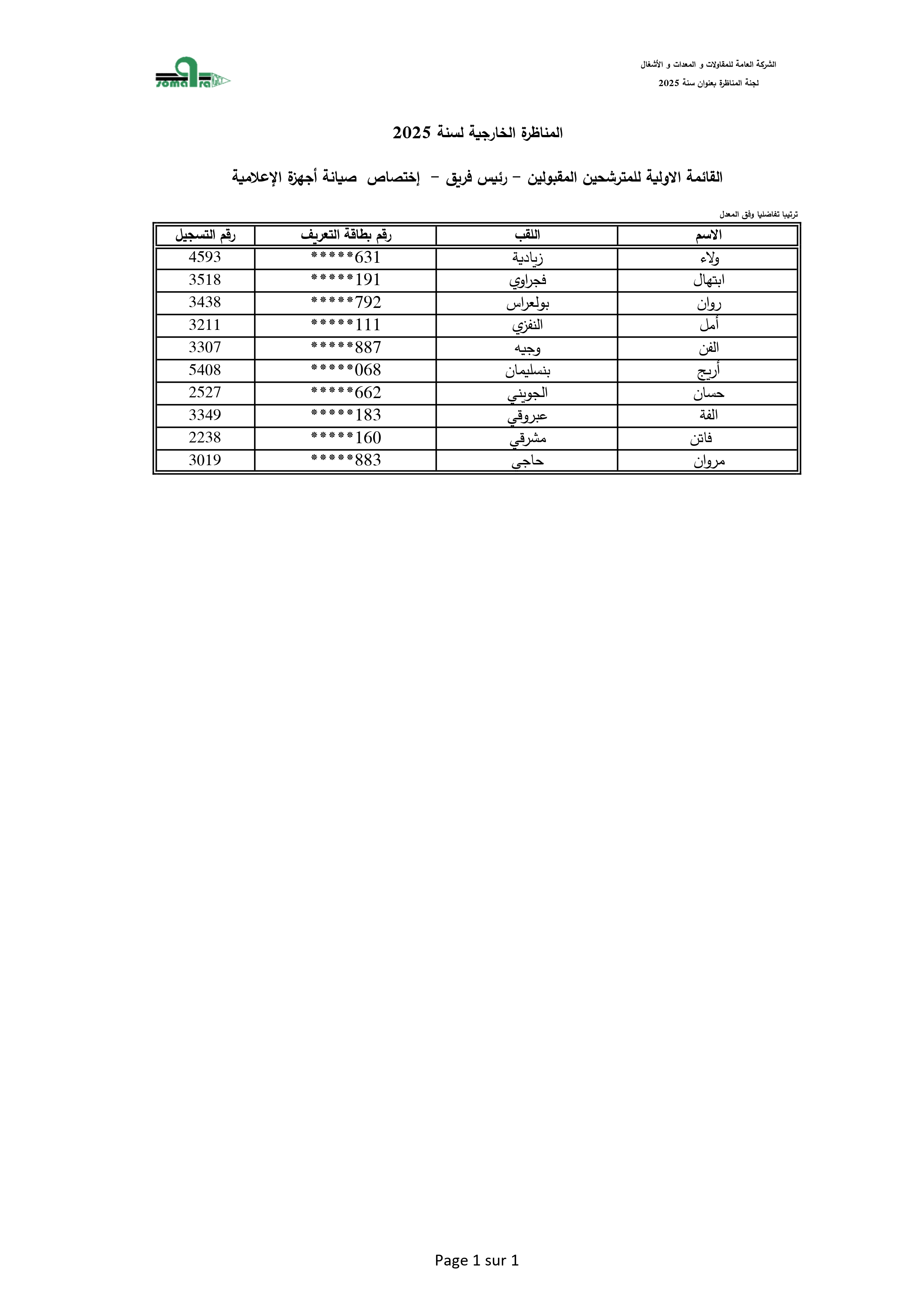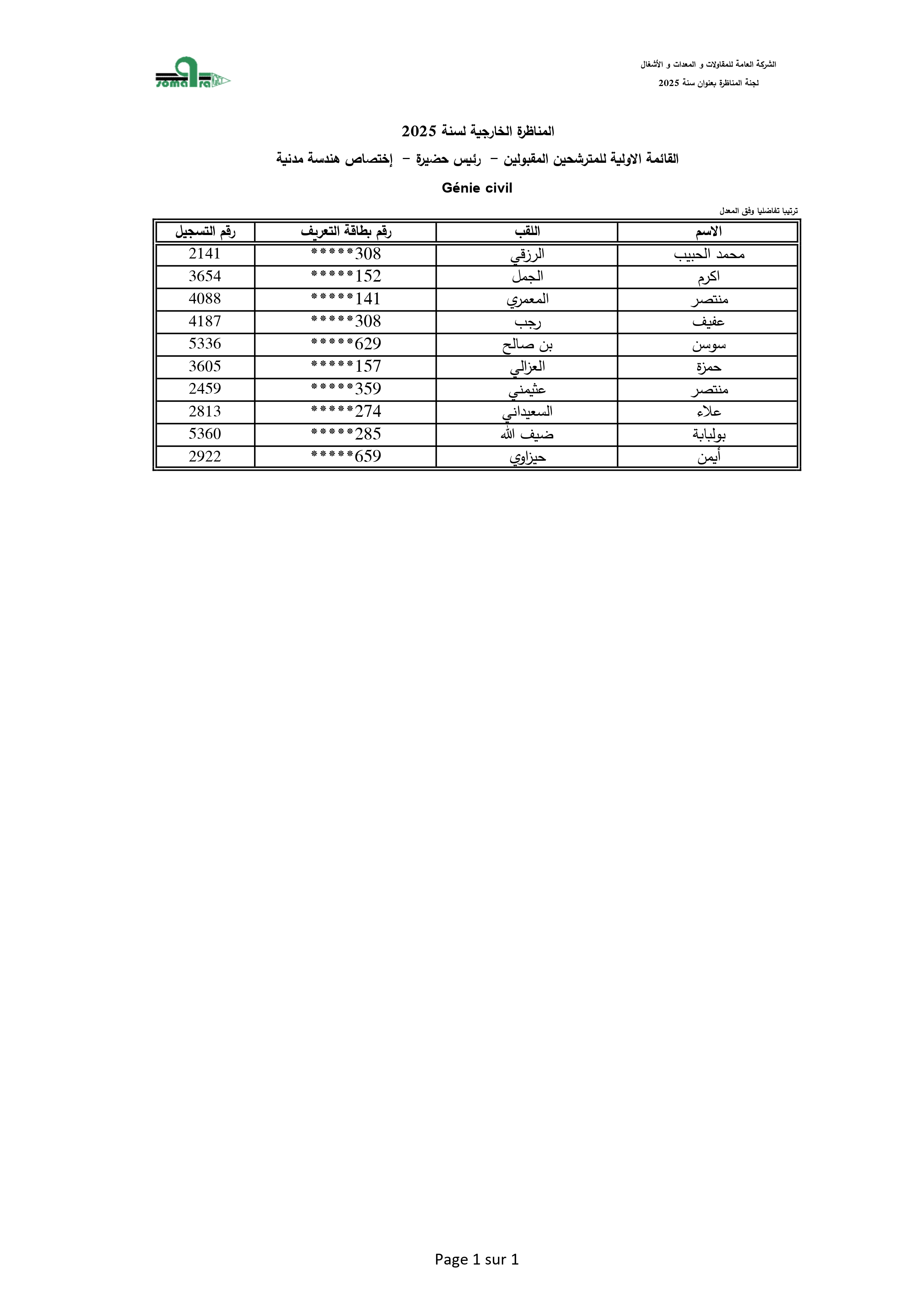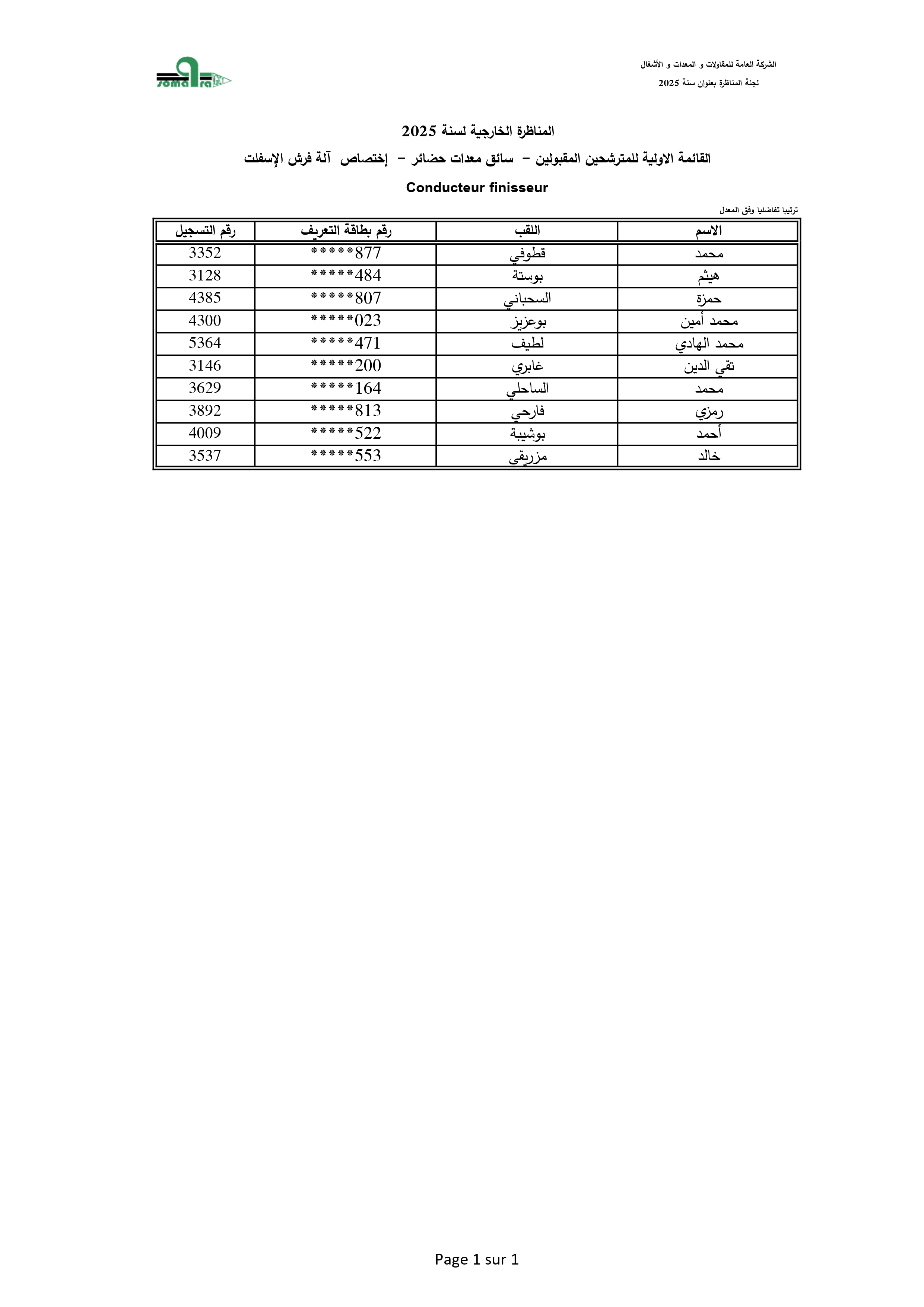 نتائج الفرز الأولي لمناظرة انتداب أعوان تنفيذ - الشركة العامة للمقاولات والمعدات والأشغال