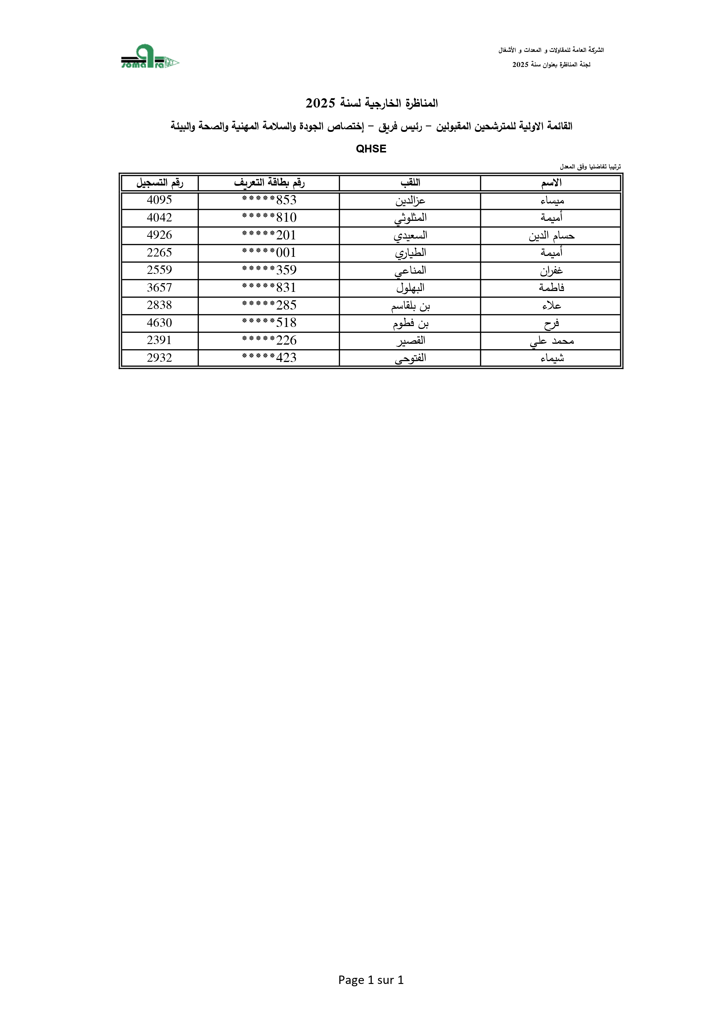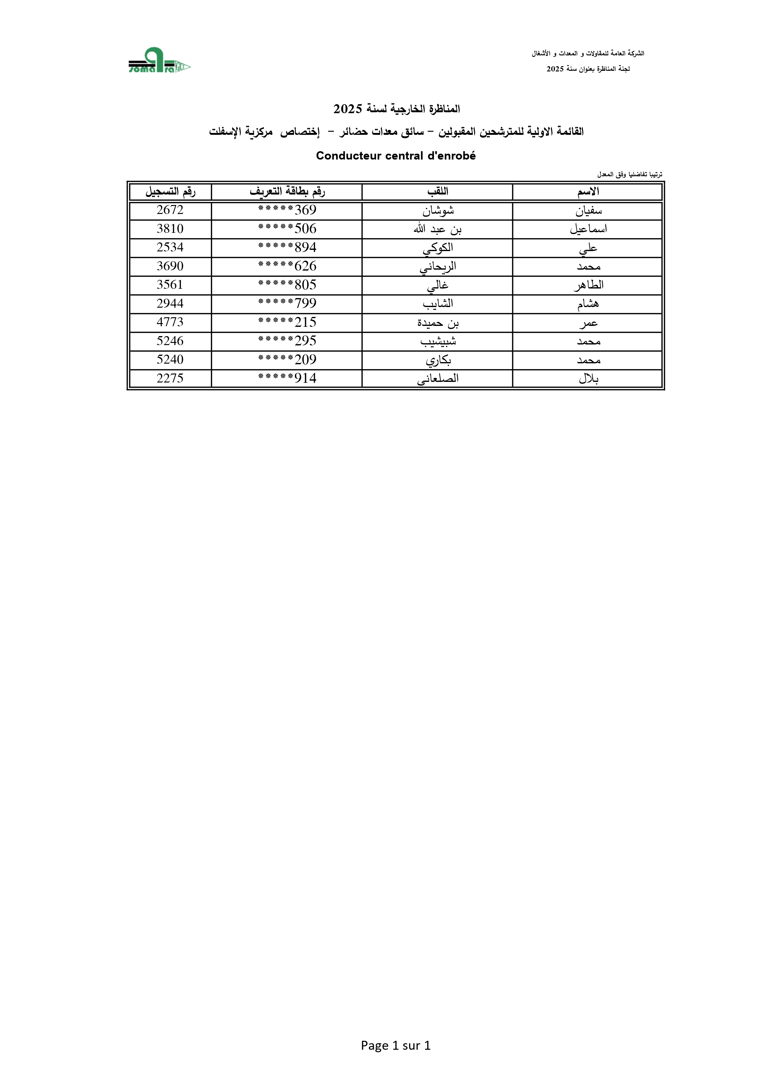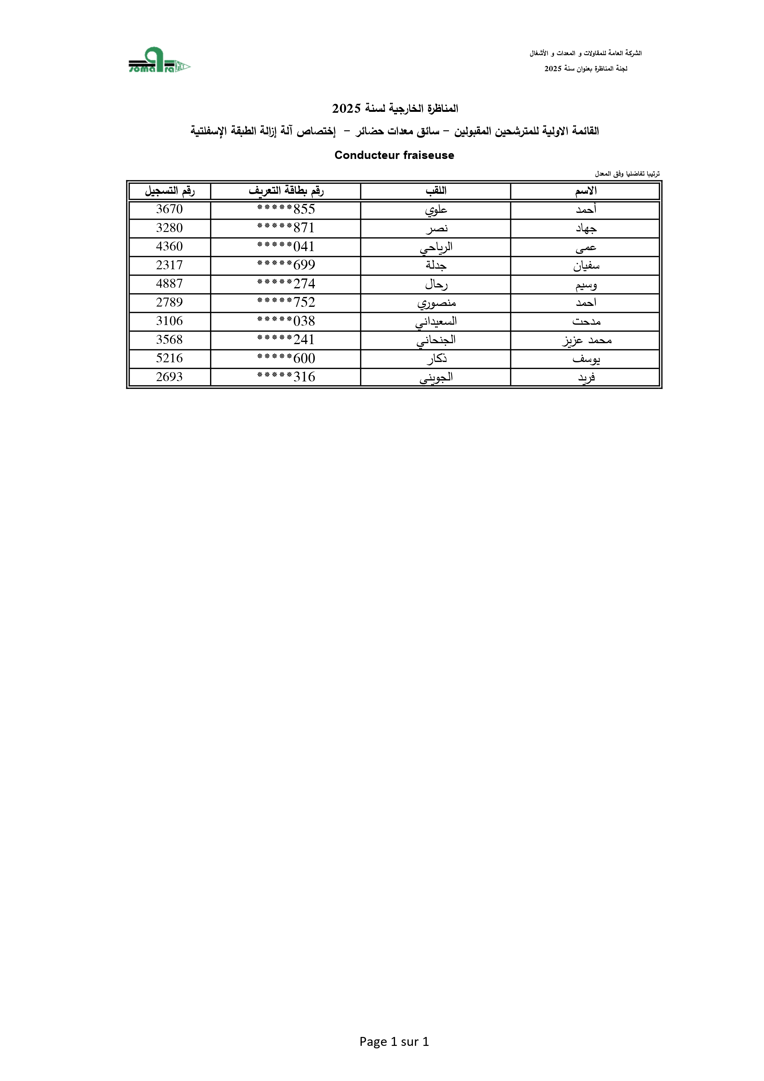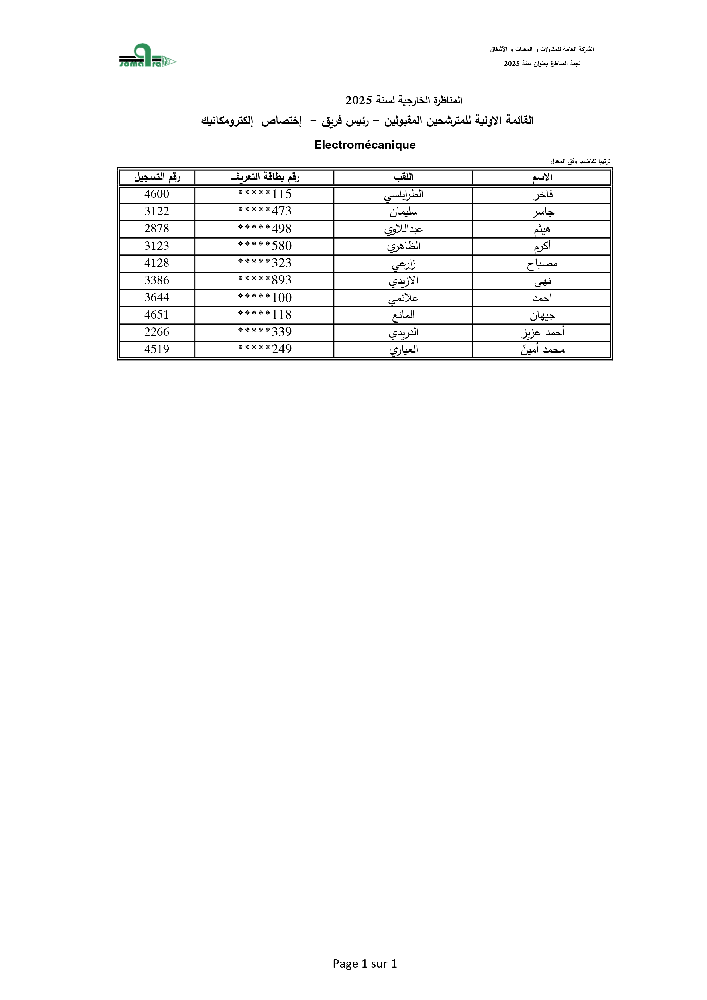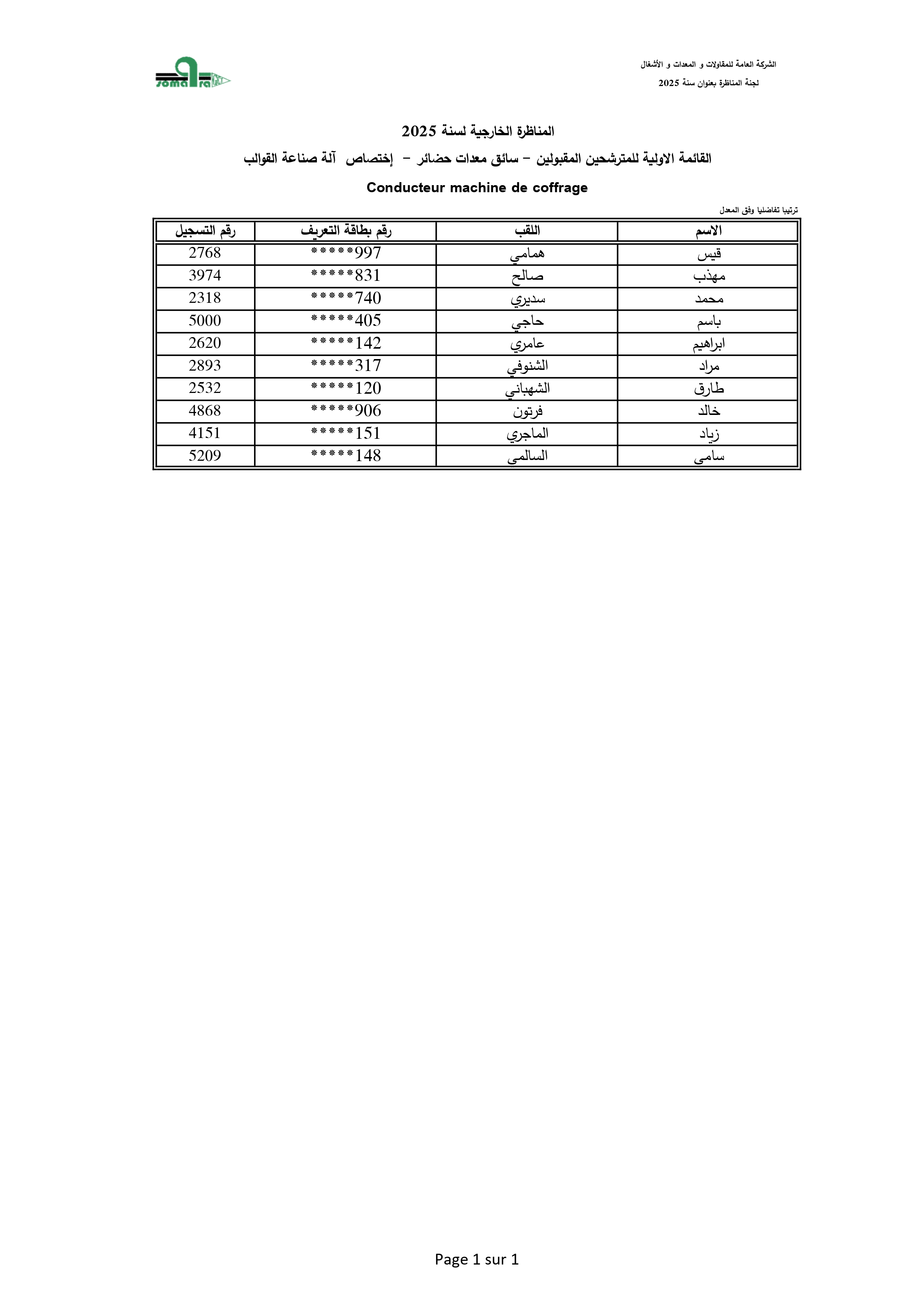 نتائج الفرز الأولي لمناظرة انتداب أعوان تنفيذ - الشركة العامة للمقاولات والمعدات والأشغال