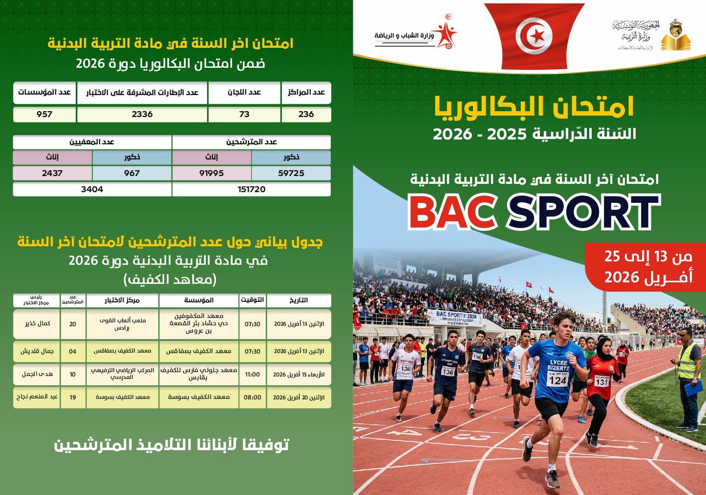 أعلنت وزارة التربية عن إحصائيات إمتحان آخر السنة في مادة التربية البدنية (Bac sport 2026) ضمن إمتحان البكالوريا دورة 2026 (باك 2026):